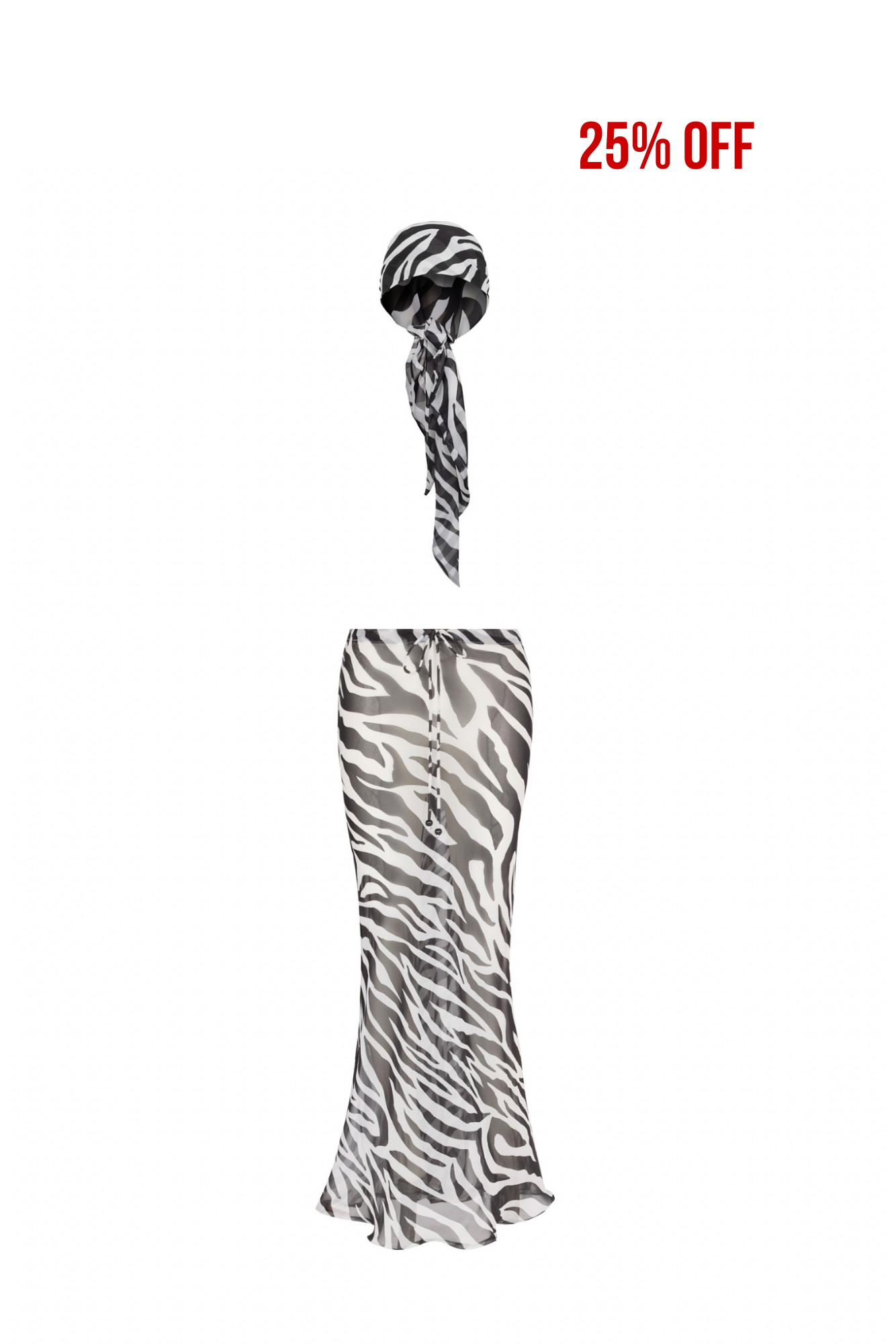 Zebra deseniyle doğal ve güçlü bir stil sunan bu etek, sahil şıklığını vurgulayan özel bir tasarıma sahip. Hafif ve akışkan yapısıyla gün boyu konfor sağlarken, bağlamalı uzun etek vücuda uyumlu bir duruş sunar. Uyumlu bandanası ile görünüm tamamlanır. Bikini üzerine kolayca kombinlenebilir; özgür ve dikkat çekici yaz stillerine modern bir dokunuş katar.