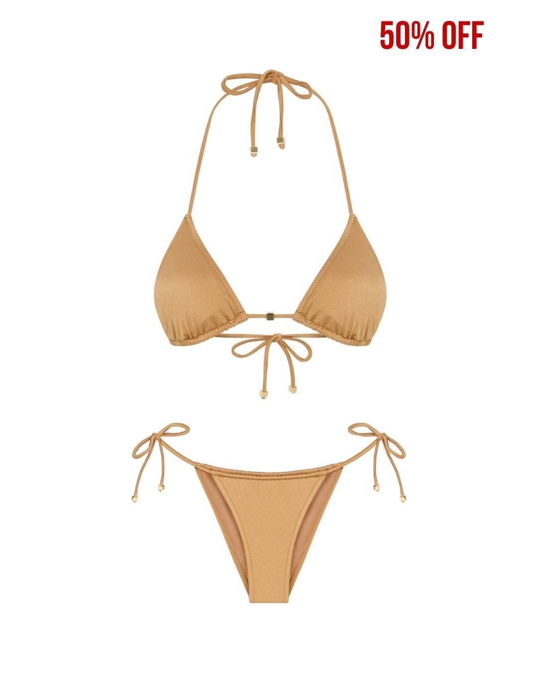 Boyundan bağlamalı, tek ipli tasarımıyla bu bikini takımı; göğüs ortası ve ip uçlarındaki kare formda gold metal aksesuarlarla sade ama şık bir duruş sunar. Alt arka kısmında G harfli gold metal logo bulunur. Tüm metal detaylar paslanmaz ve kararma yapmaz. Esnek kumaşıyla konforlu ve zarif bir kullanım sağlar.