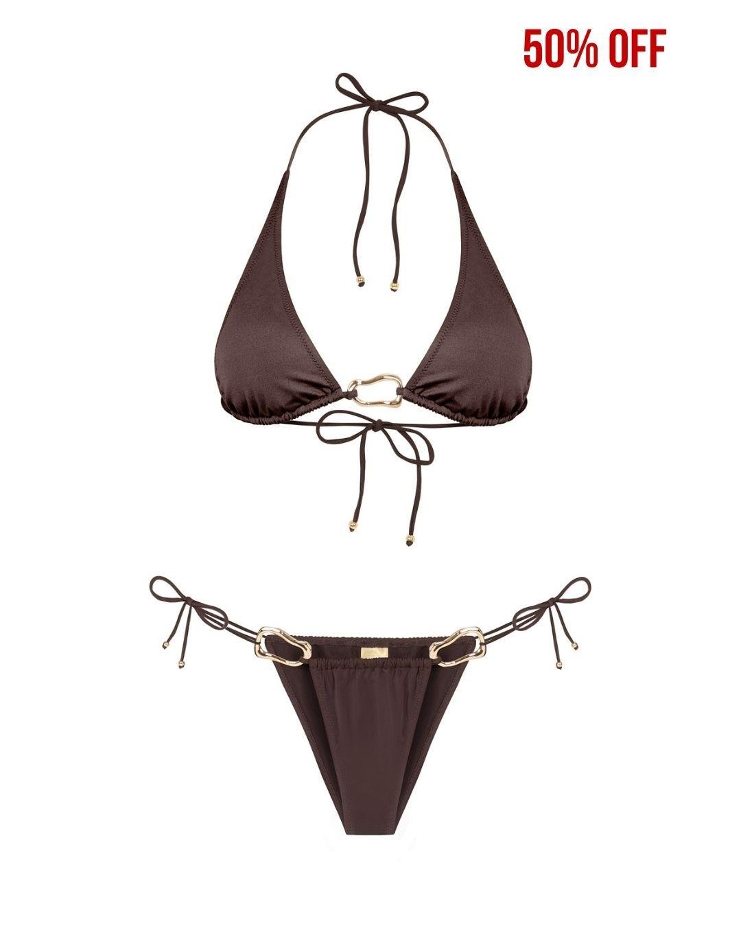 Boyundan bağlamalı üst ve çift ipli, büzgülü alt tasarımıyla dikkat çeken bu bikini takımı; büyük gold metal halkalar ve zarif boncuk detaylarıyla modern bir görünüm sunar. Göğüs ortası ve alt yanlarda yer alan aksesuarlar şıklığı vurgularken, arka kısımdaki G harfli gold logo imza niteliğindedir. Paslanmaz, kararma yapmaz metal detayları ve esnek kumaşıyla hem konforlu hem çarpıcı bir stil sunar.