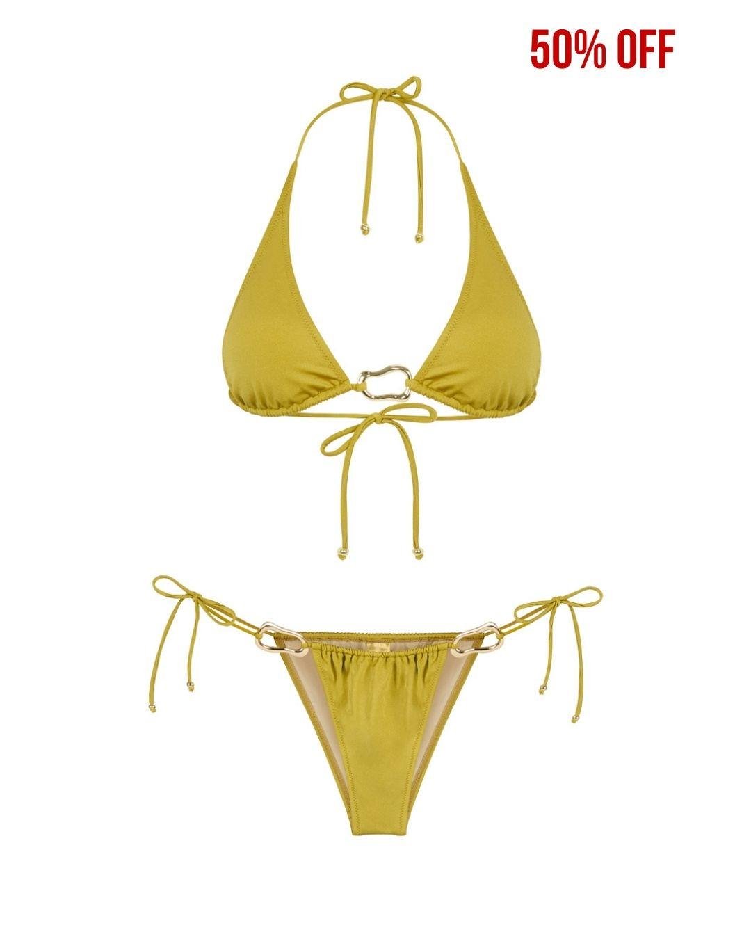 Boyundan bağlamalı üst ve çift ipli, büzgülü alt tasarımıyla dikkat çeken bu bikini takımı; büyük gold metal halkalar ve zarif boncuk detaylarıyla modern bir görünüm sunar. Göğüs ortası ve alt yanlarda yer alan aksesuarlar şıklığı vurgularken, arka kısımdaki G harfli gold logo imza niteliğindedir. Paslanmaz, kararma yapmaz metal detayları ve esnek kumaşıyla hem konforlu hem çarpıcı bir stil sunar.